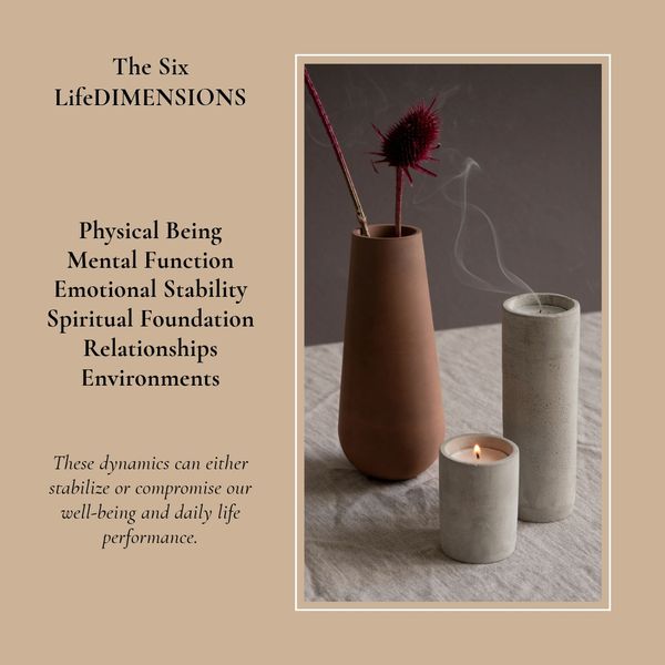 By combining forty years of health science history with two decades of research in human behavioral experiences, I was able to capture the concept of Six LifeDIMENSIONS which present as governing and directing our daily life experiences. When these six pillars are imbalanced, life quality is measurably compromised. When balanced, an individual has a greater propensity for living a more full, productive, and happy life.